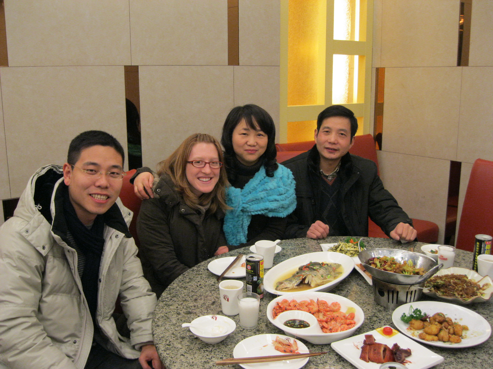 So I’m here. And after Bao gets done showing me the particulars of the appliances and fixing my internet, he makes a phone call in Chinese. “Do you want to have dinner with your student’s relatives?” he asks. I glance into the pink sun-shaped mirror on the desk at my greasy, smelly self with smudgy makeup and puffy eyes. “Yeah! Of course!”