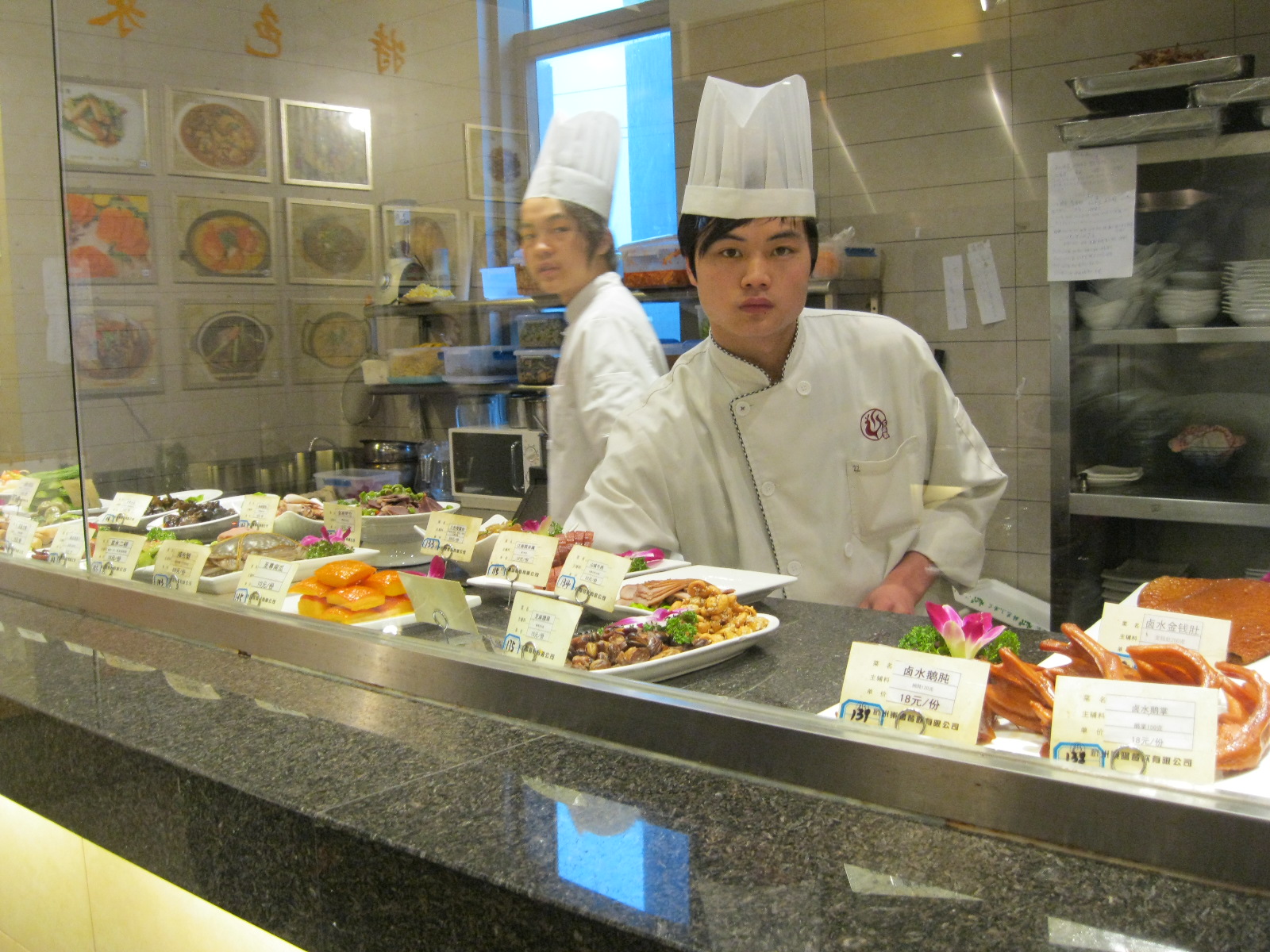 (Can you tell I didn’t ask that guy for permission to take his picture? Oops. Bao says that if I’m doing something rude, people will tell me and stop me. So I just started snapping away.) There are plates and plates of food lined up, and we start pointing at what we want. Mostly, I let them choose because I have absolutely no idea what I’m looking at, although I do tell them I like seafood. We pick a few “cold” plates out here, and then head over to the wall of pictures.