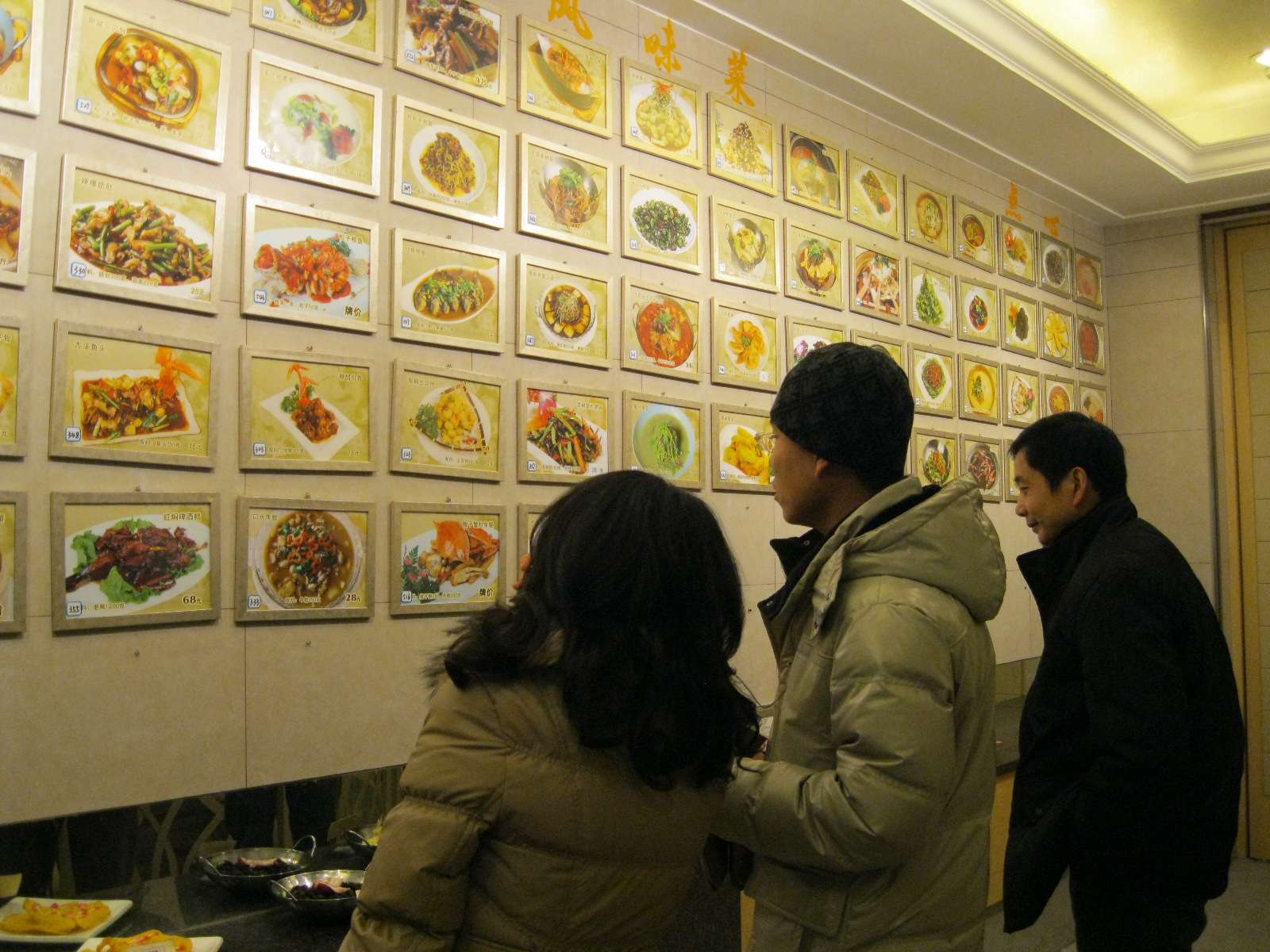 They pick us up on the corner about a block away from my apartment, in a brand-new SUV, which DW’s uncle drives through the streets like it’s an ’84 Escort with a two-toned body and no insurance. We get to the restaurant, and I get big hugs from DW’s aunt, who is teeny-tiny with a cute, frilly, winter parka and expensive-looking leather boots, and from his uncle, DW’s mom’s brother, who bears the family resemblance. It was clear in the car ride over that they don’t speak any English, so DW’s aunt takes my arm and leads me into the restaurant (whose name I’m still unsure of) and to our table. It is as cold in the restaurant as it is in my apartment, so we keep our jackets on and sit away from the windows. Our waitress brings us tea, and just as I am about to take a sip, everyone jumps up and Bao tells me, “In traditional Chinese restaurants, you point at pictures and plates of the food you want.” We head upstairs, followed by our waitress who has some little PDA-looking device, and here is what we see: