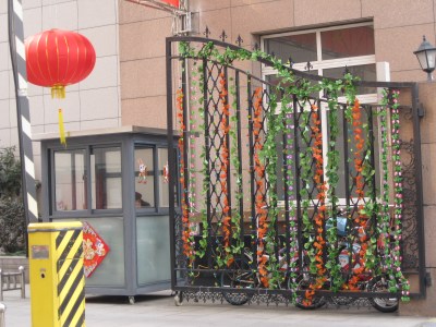A gate to an expensive apartment complex. I think these decorations are just for the New Year.