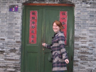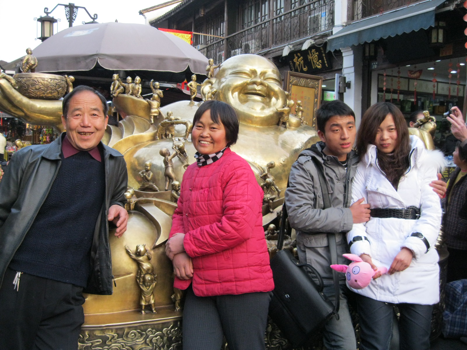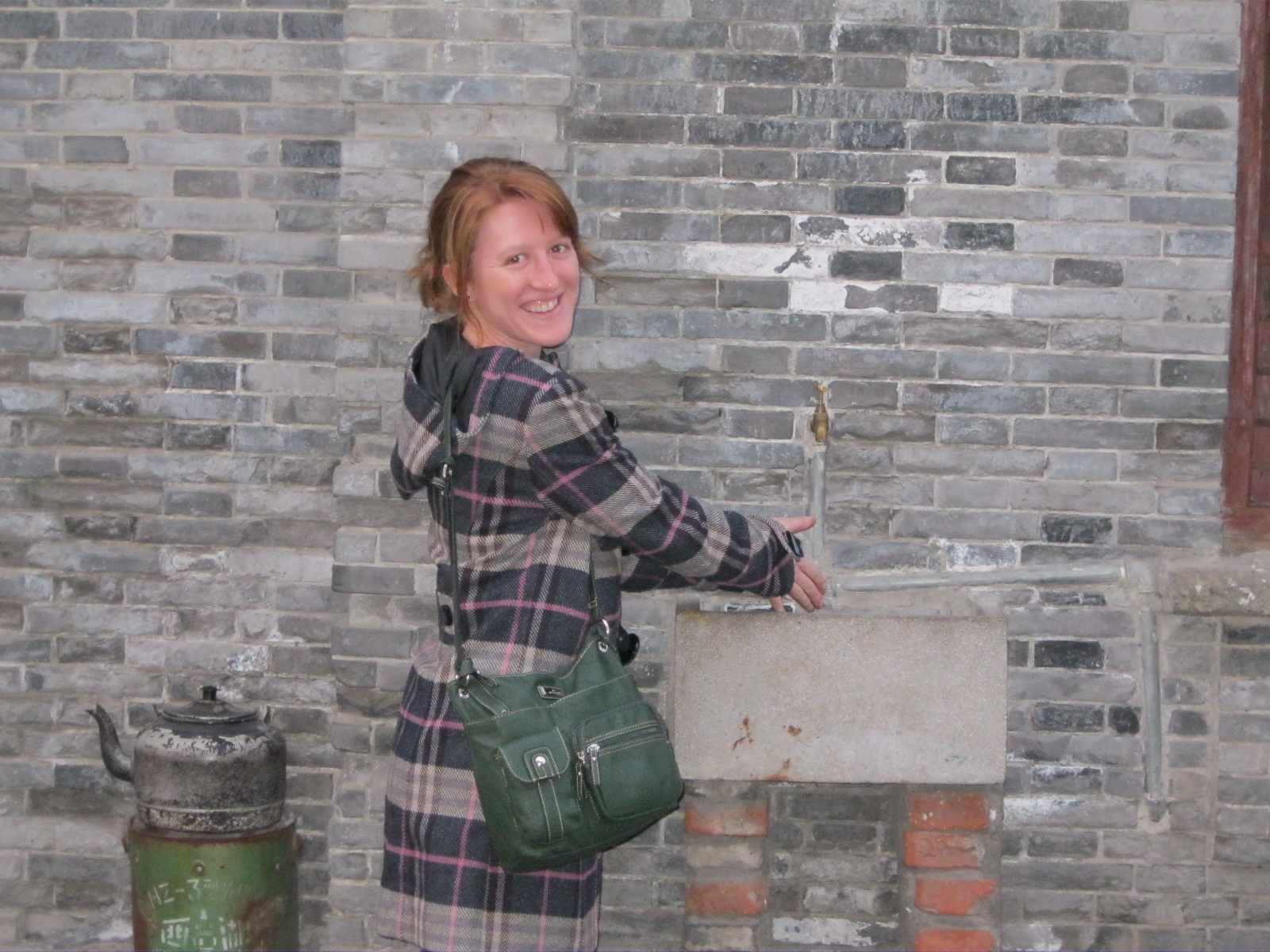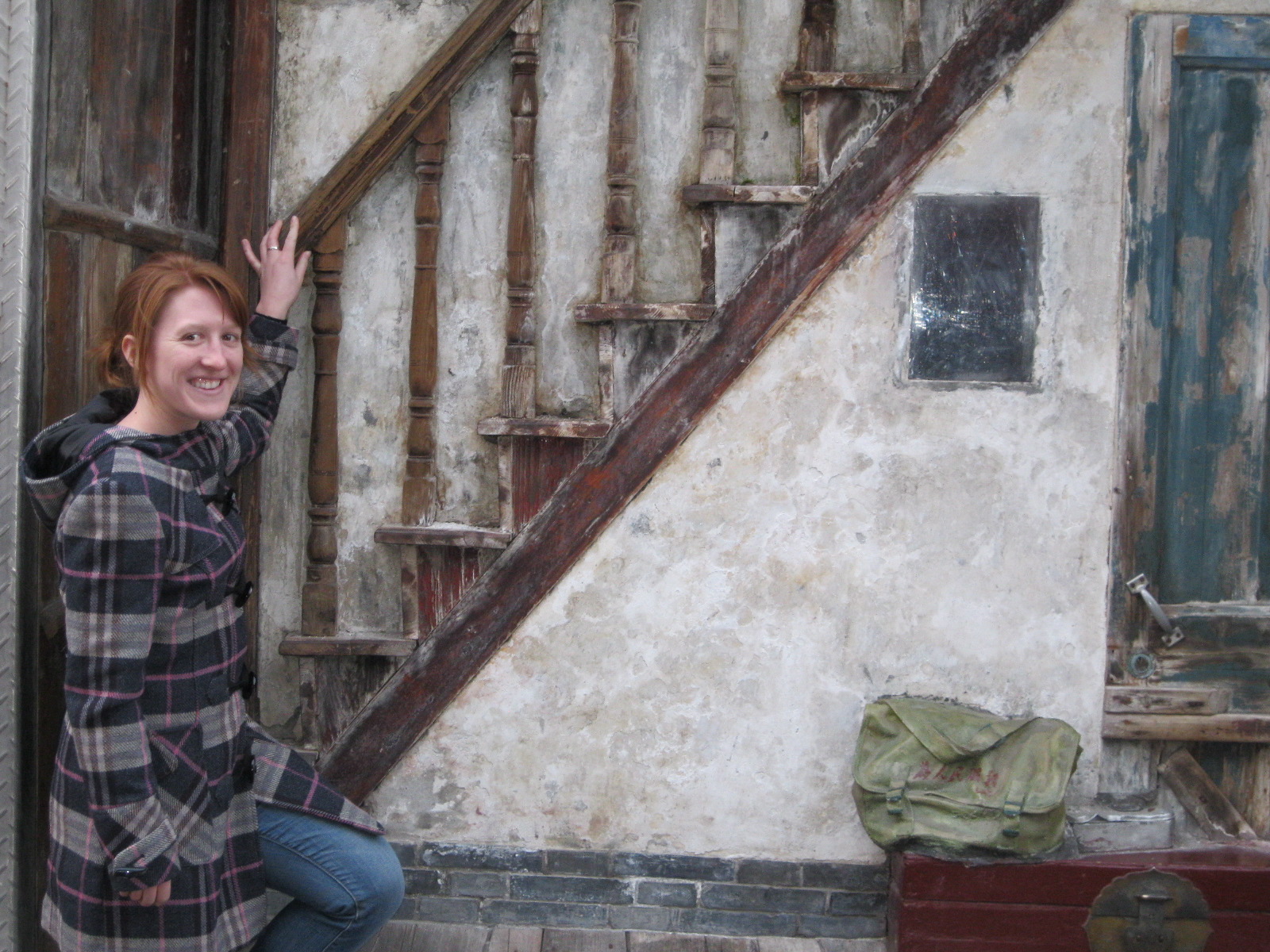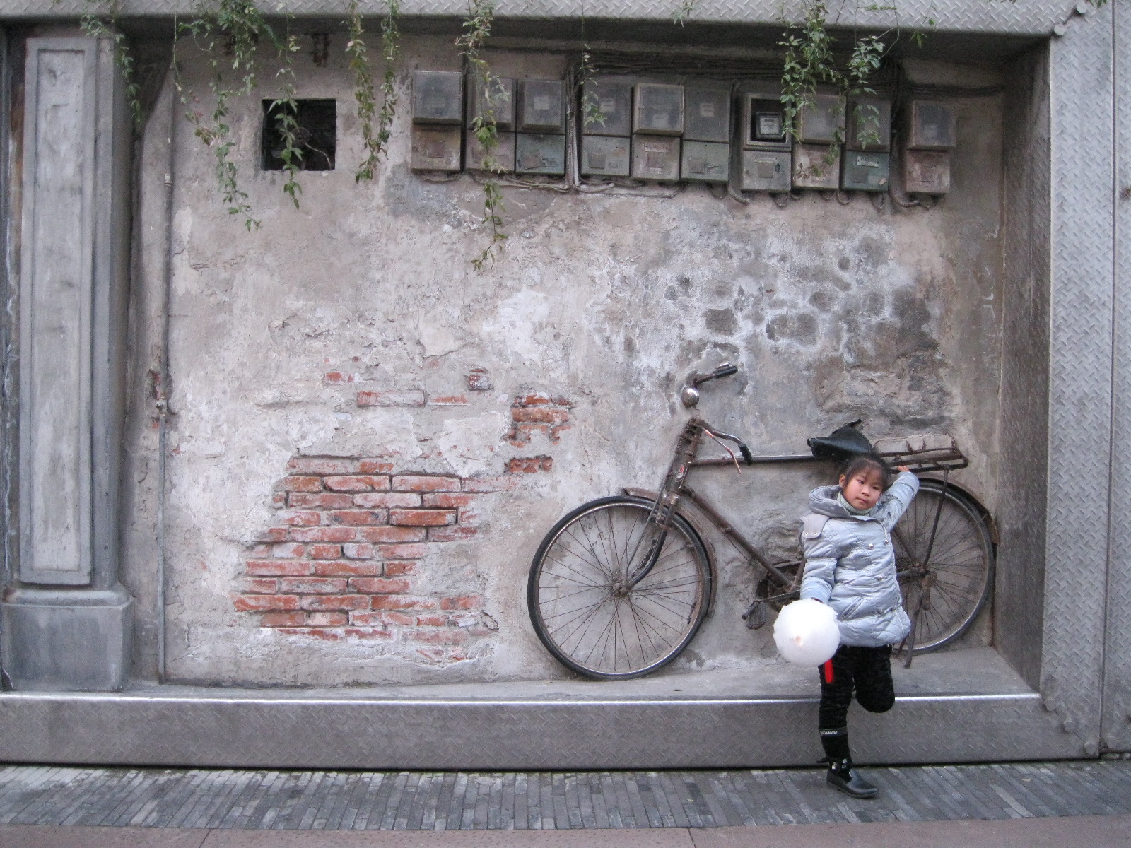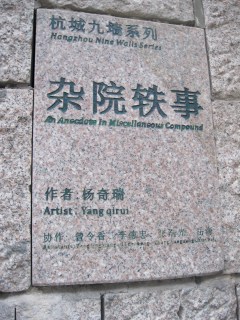 These next pictures are all taken of me (and one little girl) in front of this art exhibit on Hefang Road. There are four big stone panels that represent cutaways of a traditional Hangzhounese home. Pretty cool.
