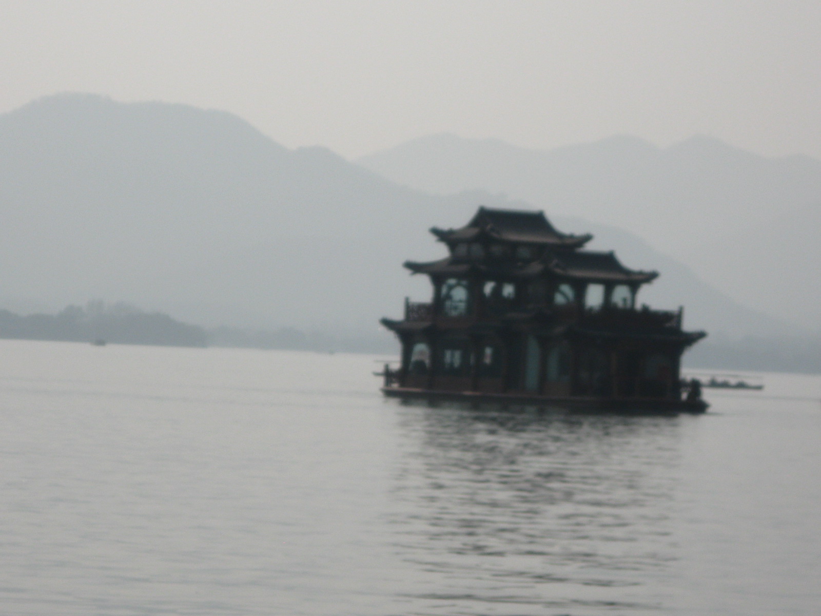 After a few hours, we went to lunch down by West lake at a restaurant Liz said is a “Hangzhou must-do.” First, she bought me a street “snack,” a deep-fried patty of pork and vegetables (yum), and then we stepped inside the busiest restaurant ever. She paid a cashier and received some tickets in return, told me to find a seat, and then disappeared into the mob of shouting people, pushing and shoving each other to order at this counter which stretched across the entire length of the restaurant. Finding a seat was hard. I ended up sharing a table with a family of three and saving a seat for us both. Eventually, Liz appeared with this: