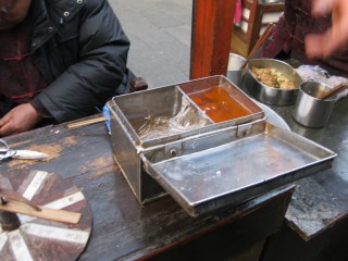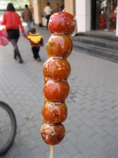 More street food. This is a type of fruit called shan zha; I’d never seen or heard of it before. (I looked it up on the world wide web, and it’s also called a hawthorn berry.) The berries are caramelized with crunchy sugar, and they taste (to me) a lot like strawberries with big seeds in the middle. De-lish. I could eat approximately 85 of these every day. Sidebar: I should’ve guessed, early in the day when we got Taiwanese milk teas, that Liz was going to buy me every single type of food she thought I should try in Hangzhou without asking if I was hungry. Yet another reason I love her.