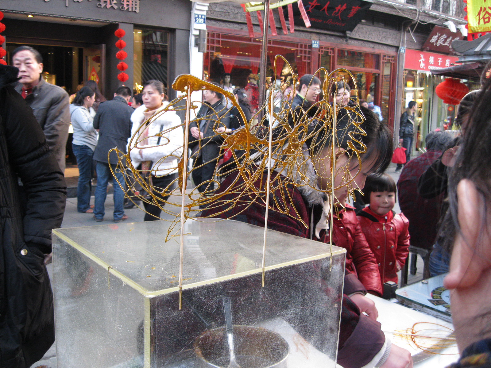 This woman was painting sugar treats onto a wax board. You pick the animal or design you want, and she creates it while the sugar is hot and melty. On the right is a lantern; on the left is a bird.