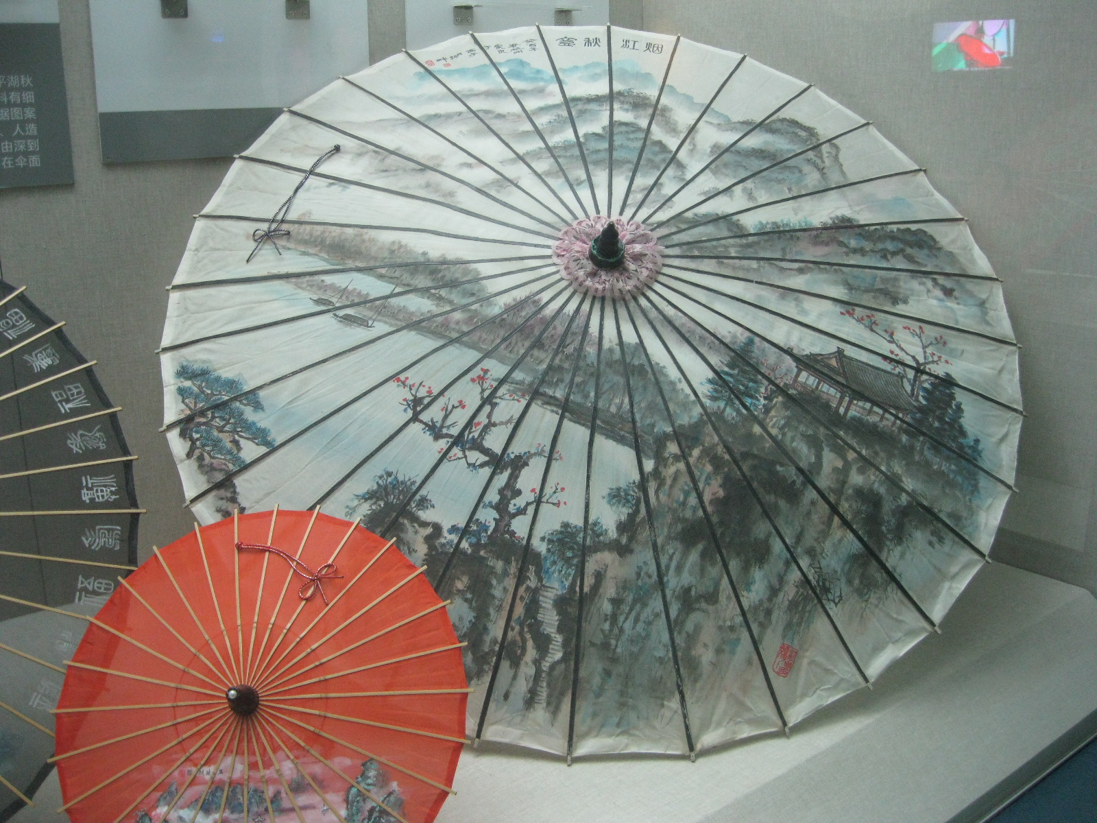 An umbrella with a painting of West Lake. The constructions of fans and umbrellas are very similar in some ways, though their functionalities are so different.