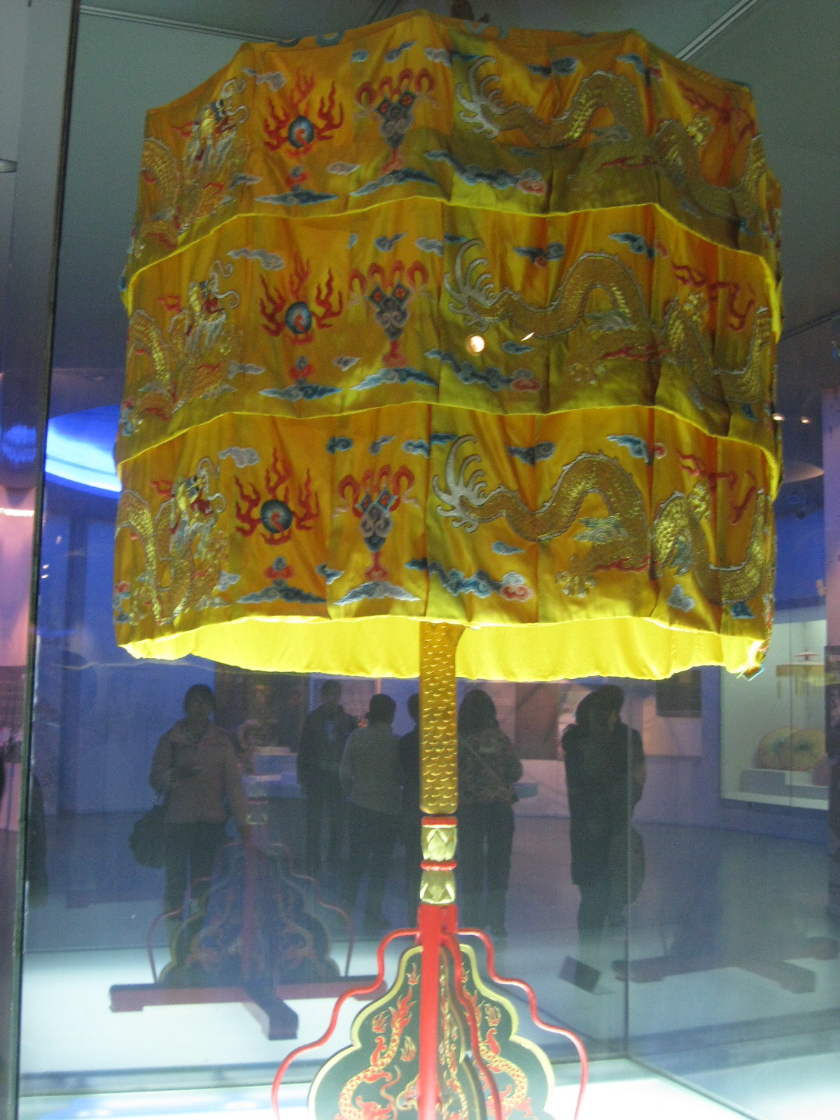 A big fancy umbrella for emperors. Even if the size and material didn’t scream “Emperor!”, the embroidered dragons would.
