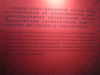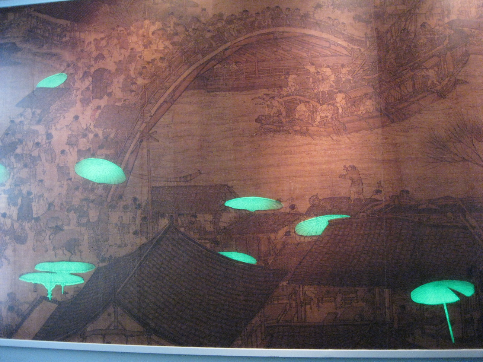 This is a replica of a very famous Chinese painting that holds over 850 people, all of them created as individuals with unique faces. This replica is designed to illuminate the presence of umbrellas in the painting. It’s much, much larger than this, but I took a picture of the corner with the most umbrellas.