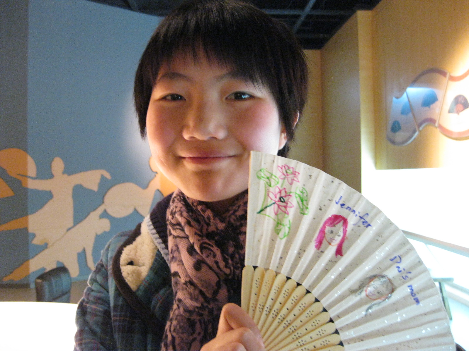 Yifei said (through Daisy), “Jennifer! You must draw yourself on a fan!” I have possibly the most cataract-ic artistic eye of anyone I know, but I said, “Okay!” I drew all four of us- well, I drew our heads. Poor Sean ended up with purple hair because I thought I grabbed a black marker but was mistaken.