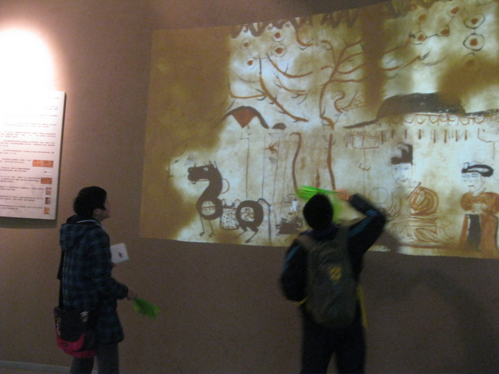 This display used a projected image and motion sensor technology to allow Daisy and Sean to “brush” away the sand on top of the image using real fans.