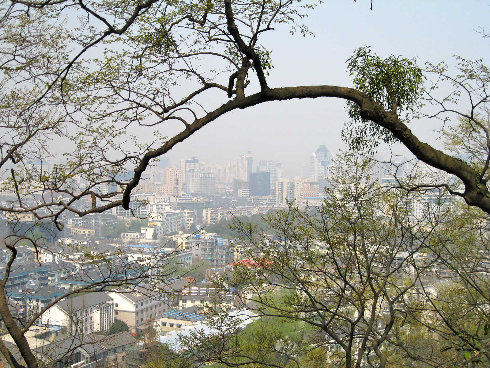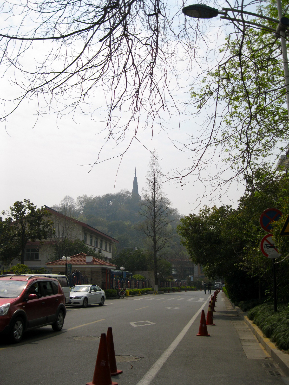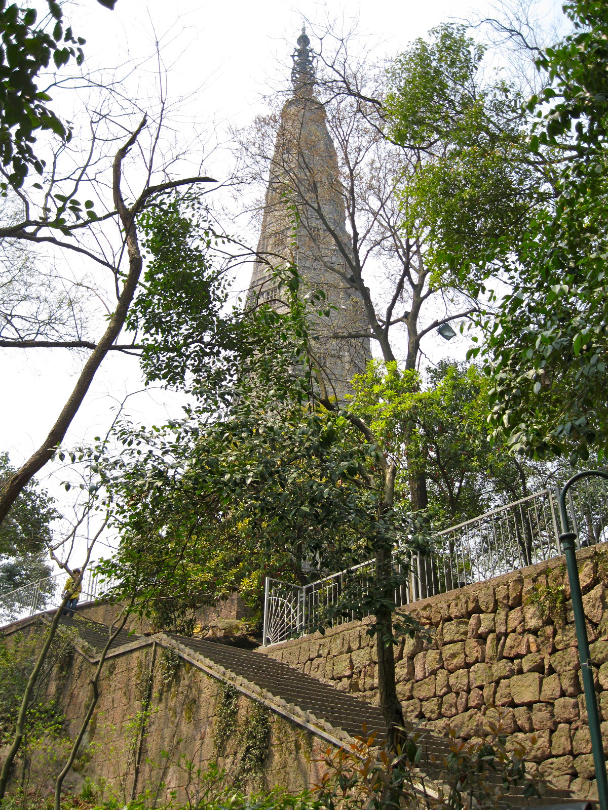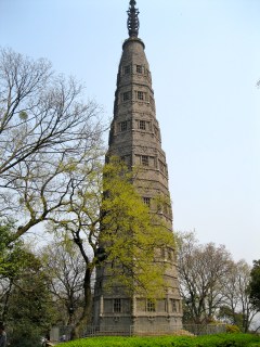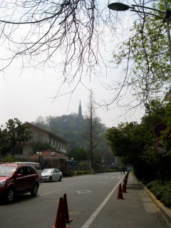 I ended my day by climbing Baochu Hill, which is within a few kilometers of my apartment (I live on the corner of Wen’er Lu and Baochu Lu). At the top is Baochu Pagoda, which looks like this from the street: