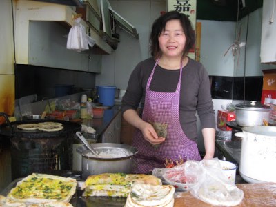 These little pancakes are filled with green onions, and they’re a common afternoon snack. This lady makes the best, in my opinion. While others lay the onions lengthwise in the pancake, she cuts them into little circles, guaranteeing that oniony zing in every bite.