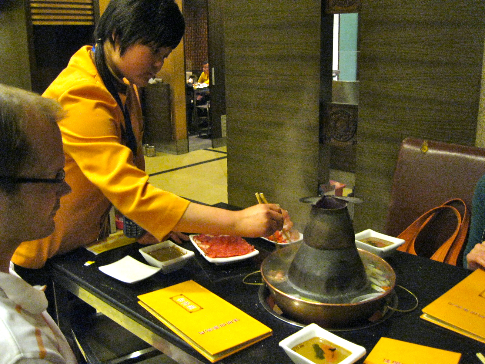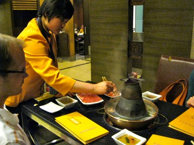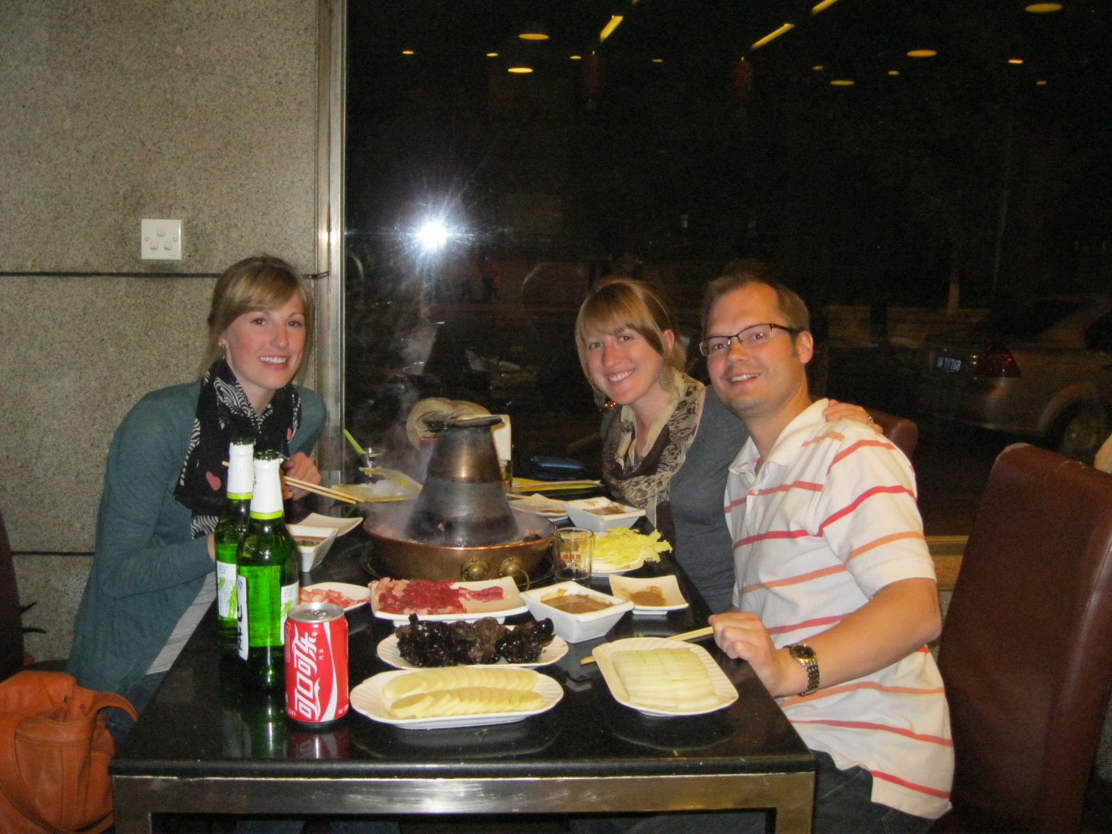 We also tried hot pot when Matt’s cousin’s fiancee, Amanda, joined us for the weekend. (She’s teaching at a school in Baoding, which is about an hour-long train ride from Beijing.) Hot pot is sort of like Chinese fondue: you choose a broth, a sauce, some meat, some veggies, and maybe some noodles, and cook it all at your table. The broth boils the whole time, so everything takes just a minute or two to cook. When it’s ready, you rescue it from the brew with your chopsticks, dip it in sauce, and enjoy. De-lish.