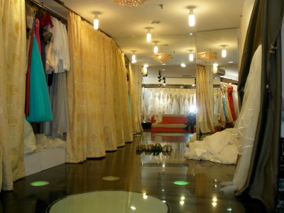 Like any bridal store, you can find lots of spectacularly hideous dresses for both brides and bridesmaids here, but I did find a nice selection of really beautiful dresses too. I intended to try some on just for idea-gathering purposes, but at the 3rd store I visited, I tried on a dress that I really liked. Even then, I didn’t intend to buy it because it wasn’t perfect and I had no idea how to communicate the alterations I wanted to the very friendly women running the store.