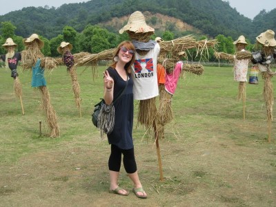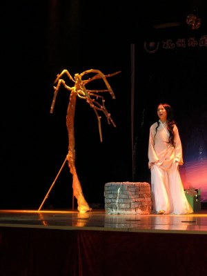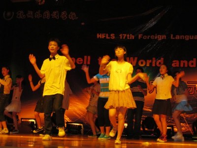 Since Drama Night was scheduled to take place on Thursday from 6:30-9:30pm, I was going to spend a long day on campus.  Unlike Minnetonka, which boasts approximately 489320 theater performances every year (not to knock MHS; our theater community thrives and teems with talent), this is HFLS’s only dramatic anything all year long, so the kids were buzzing with a special kind of energy that I hadn’t really seen before.  I took my sweetly, unflaggingly obedient Junior 1s for class outside that morning because our door was locked and the weather was perfect; they were supposed to be editing their original skits, but it took about 3 minutes for their “wands” to turn into “swords,” which turned into just straight-up “stick beating.”  I watched them for a while before stepping in, reflecting on how Chinese kids seem to not be as (over)protected as American kids (see: Kids Riding Electric Bikes through Insane Traffic Sans Helmet) and noticing that because so many of my students wear glasses, a.k.a. safety goggles, maybe I didn’t have to step in…