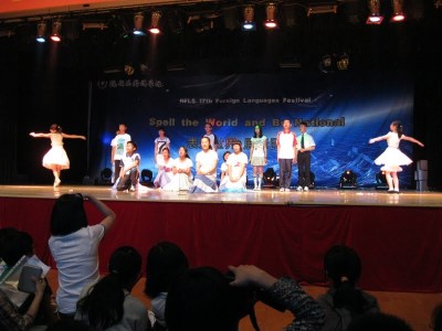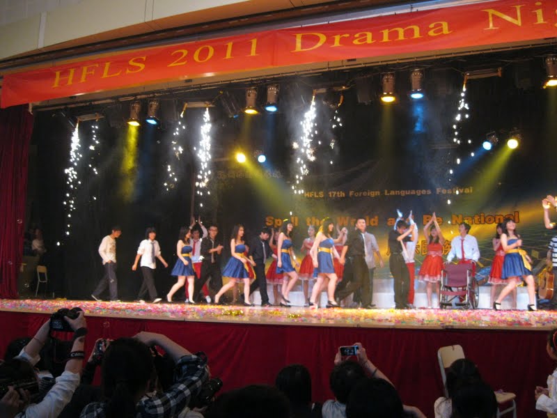 Every year at HFLS, the students participate in Language Week- a celebration of all things English- which culminates in this event called Drama Night and a full day of speech competitions and spelling bees.  The campus is transformed by the flags of many nations, a giant red arch, and professional-looking posters advertising the Drama Night performances.