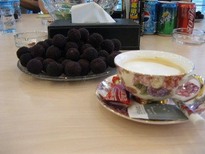 Her staff served us freshly brewed cappuccinos, expensive green tea harvested during Qing Ming, and heaping plates of waxberries (and if you’ve never tried a waxberry, I’m sorry to tell you that you haven’t truly lived).
