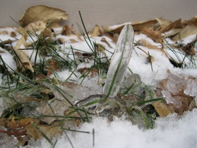 We’ve had a significant dearth of snow this winter, due both to lack of precipitation and unseasonably warm temperatures. During the mild end of one freeze-thaw cycle about a month ago, our still-green grass grew glass casings of ice overnight.