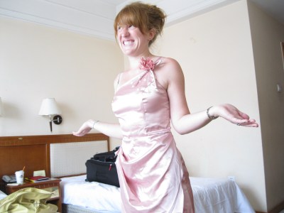 The women at the shop remembered me right away (“The sunburned redhead with terrible taste is here!”). My dress was unceremoniously wadded up in a flat plastic wrapper made for a t-shirt. I shook it out and put it on, and I could see that they’d made the modifications I’d asked for: the dress was shorter, it was fruit-salad pink, and the flower at the waist had been removed. Unfortunately, this meant the swoop of fabric you see in the picture actually was hanging down like a real apron until I asked that it be stitched back up.