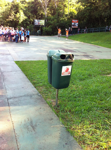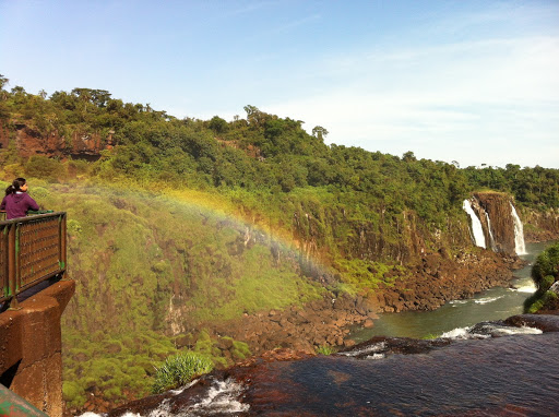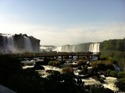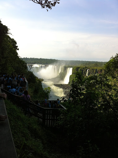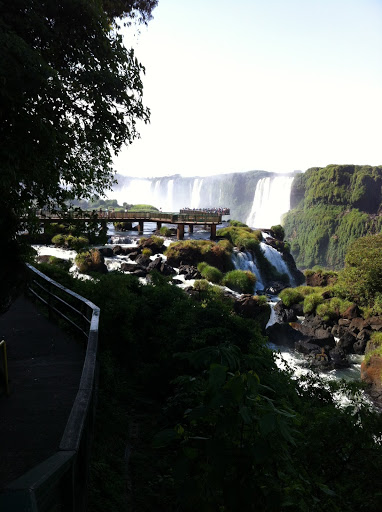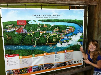 Anyway, we get into Brazil, find a couple of breakfast empanadas, follow some signs to the falls- cataratas– and by the miracle that is My Husband Driving in Foreign Countries, we find Iguazú. You can visit the falls from both Argentina and Brazil; in Brazil, they are housed in a lovely national park. Everything about El Parque Nacional do Iguaçu is immaculate, kind of like Disney World. It is so clean and well-organized, and it also has many colorful maps starring cartoonish people and animals who can probably talk. And like Disney World, it hosted approximately 85,000 chattering children on the day we visited.