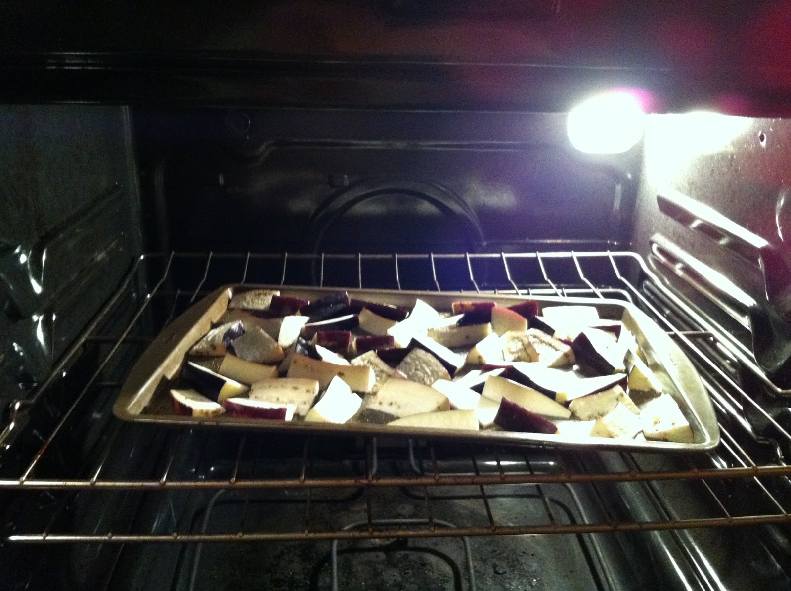 I freestyled the next part a little bit, but I was super happy with the results. I threw some minced garlic in two tablespoons of oil and fried it up. (Is there any better smell than that of frying garlic? No, no there is not.) Then, I mixed in about half of that can of sauce. I added some fresh ginger and probably two or three tablespoons of soy sauce, and then I let it simmer. When the eggplant was done, I just tossed it right into my sauce pan.