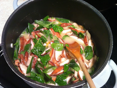 Shiitakes, spinach, and habañeros. You could substitute baby bok choy for the spinach, too.
