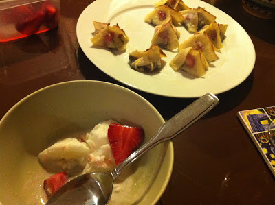 For dessert, Lyssa made these chocolate-strawberry wantons that we baked before eating. They were sweet and tart and complimented well by a little coconut-lychee ice cream.