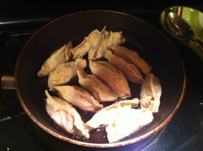 Once your wraps are done, heat a little oil in a frying pan, and drop those bad boys in. Once their bottoms have browned and without burning your house down, pour in a half-cup of water and cover the whole thing, letting them steam. They’ll need about ten minutes. Side note: I highly recommend using chopsticks to place them in the pan and to take them out again to lessen the chance of oil burns.