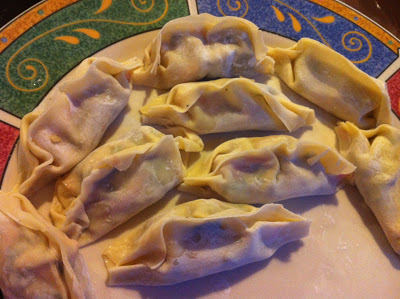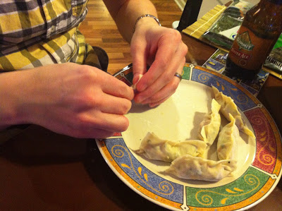 Once the filling is done, you start wrapping. Have a little dish of water on hand, because dabbing a few drops on the edges of the wrap is what holds it all together.