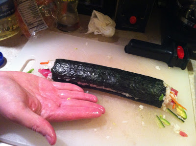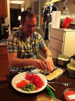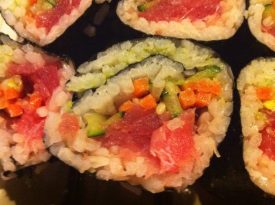 Generall, we roll sushi with avocado, carrots, and cucumbers. Sometimes we throw in sprouts, too. And of course, the fish!