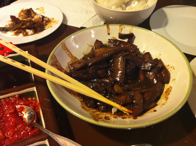 The one on the left is a plum and bean sauce, and the one on the right is a spicy bean sauce for eggplant dishes (or so says the label). For my first eggplant adventure, I made the middle sauce, simply called “sweet bean sauce.”