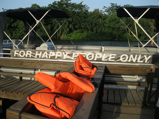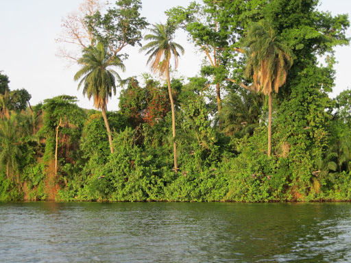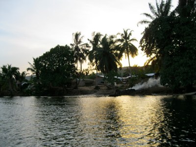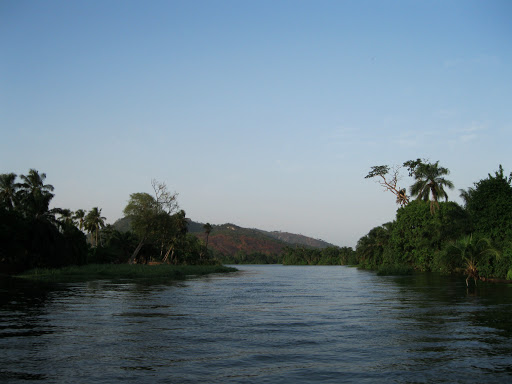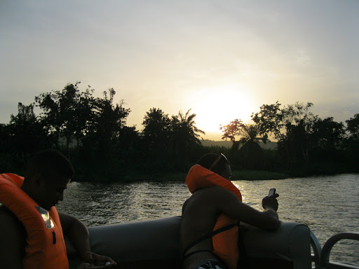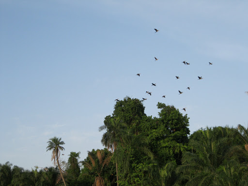 The river banks were crowded with lush forest. We passed tilapia farms and huts and naked kids waving. We waved back. We saw a fancy resort patio with two white people who waved at us. We disturbed many flocks of cormorant-like birds, and Enam entertained us with his dancing.