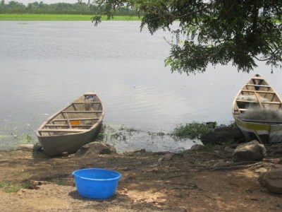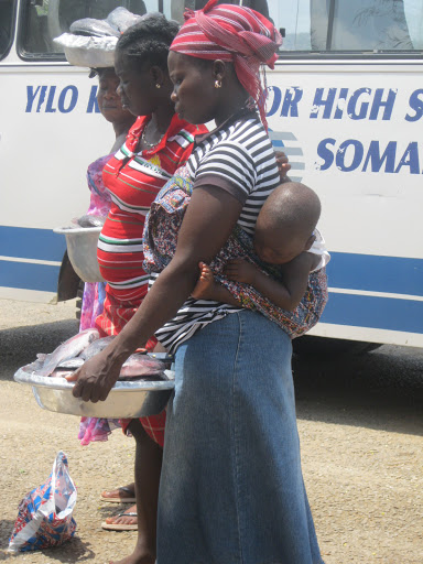 On our way back to Somanya, we took a detour and wound down a dirt road lined by huts and the Volta River. It was around noon and the sun was ferocious. Women with big silver bowls full of three-pound tilapia surrounded us. One had a baby strapped to her back with a wide swath of colorful fabric.