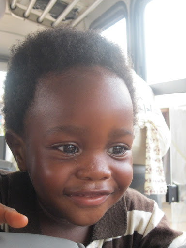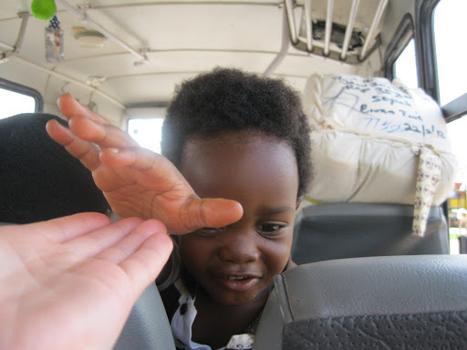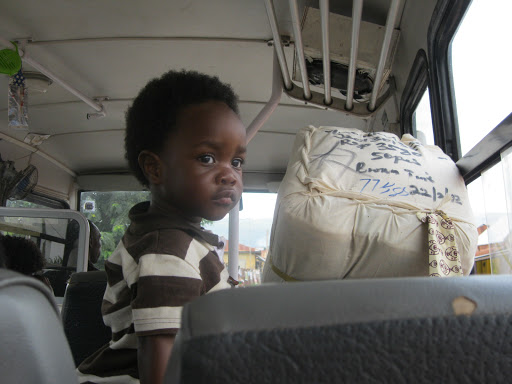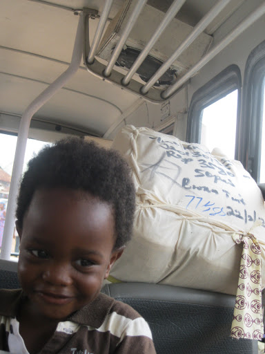 Gabby had mentioned taking us to buy tilapia on the shore of the Volta, so after a mid-morning nap, we met him in the courtyard. He told us he’d ordered a taxi because Jay and Enam were coming with us and, he laughed, “You see how the boy likes to be on my lap when I drive! But the police do not like that very much.” While we waited in the shade, another teacher spotted Matt. She walked over with open arms and embraced us both. “Brother Matthew! You have grown bigger!” And to me: “How many times every day do you feed him?” Four, maybe five, I told her, and she laughed. She- one of the aunties- was headed to buy fabric for the students’ ceremonial Friday uniforms, and she was taking the school tro-tro. Did we want to ride along? So the taxi came and went and the five of us got into the school bus.