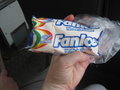 | My absolute favorite snack! It was the only thing that ever really tasted cold. It’s basically soft serve in a bag- see the lower left corner where I’ve bitten it open? Mmm. So. Good. |