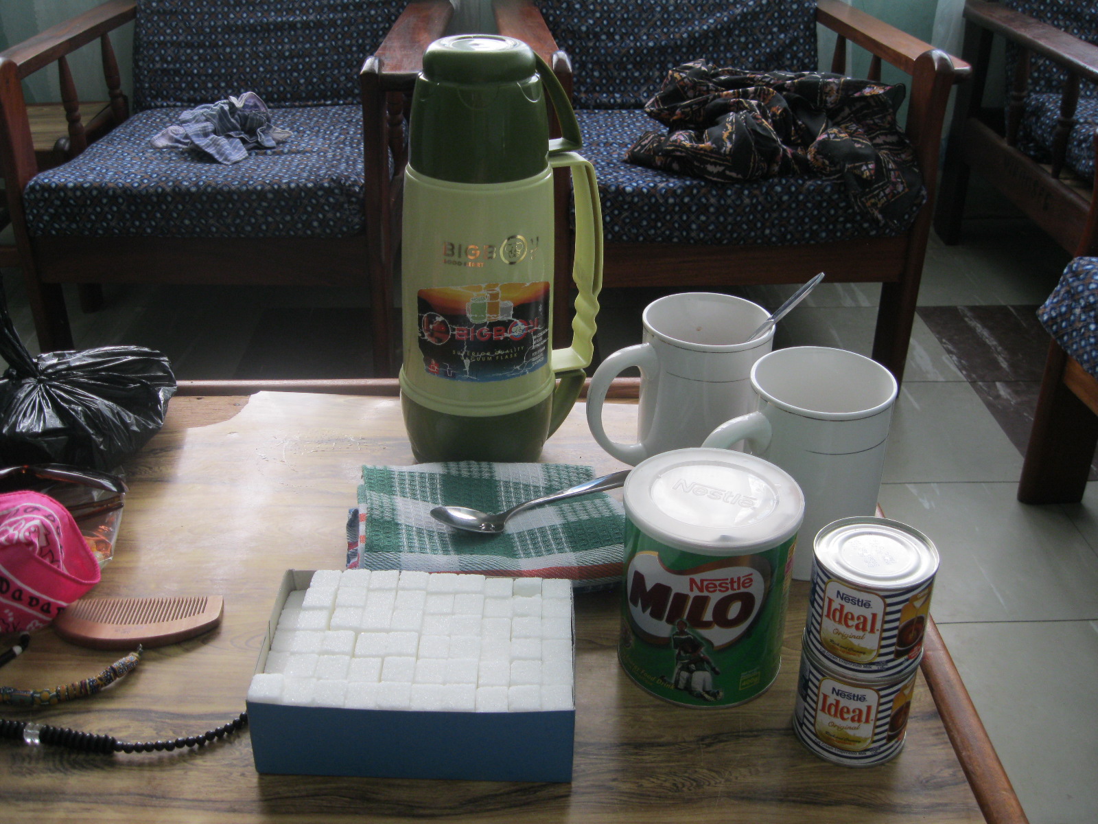 Next, he poured us palm wine- the sap of palm trees left to age, which becomes more potent with time. Gabby said that when the wine is very young, even children can take it. (Ghanaian English retains some Britishisms- rather than having breakfast, you take it.) The palm wine was sweet and tart and entirely too much for my ailing stomach. Gabby explained that many people drink it mixed with Guinness. To that end, he poured Matt a liter-sized mug (the same size as I’d used that morning to drink Milo) half-full of palm wine and topped it off- literally- with a Guinness.