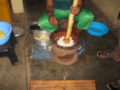First, you boil unripened plantains and cassava root (yams in the north). Then, you pound the crap out of them in a giant mortar and pestle until the starches break down and you end up with a big sticky dumpling. It’s really a two-person job (see video), but Matt’s host mother during training, when he was up in Techiman in northern Ghana, pounded and rotated the fufu all by herself. Matt said she had impressive shoulders. No doubt!