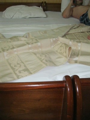 Even though it was sort of a strange place (for example, the shower’s water heater- which we did not use- had exposed wiring on the shower head, and our “king-sized” bed was really two twins pushed together), we got to spend our first night in many in blessed air conditioning. Ah-mazing. We both slept well.