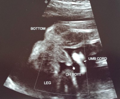 Our ultrasound tech told us that she wasn’t able to get a good shot with the 3D camera, but she was able to tell, with “93% accuracy, ha-ha,” what sex our baby was. She printed off a picture with this crucial information and put it into an envelope. We left, giddy and giggling.